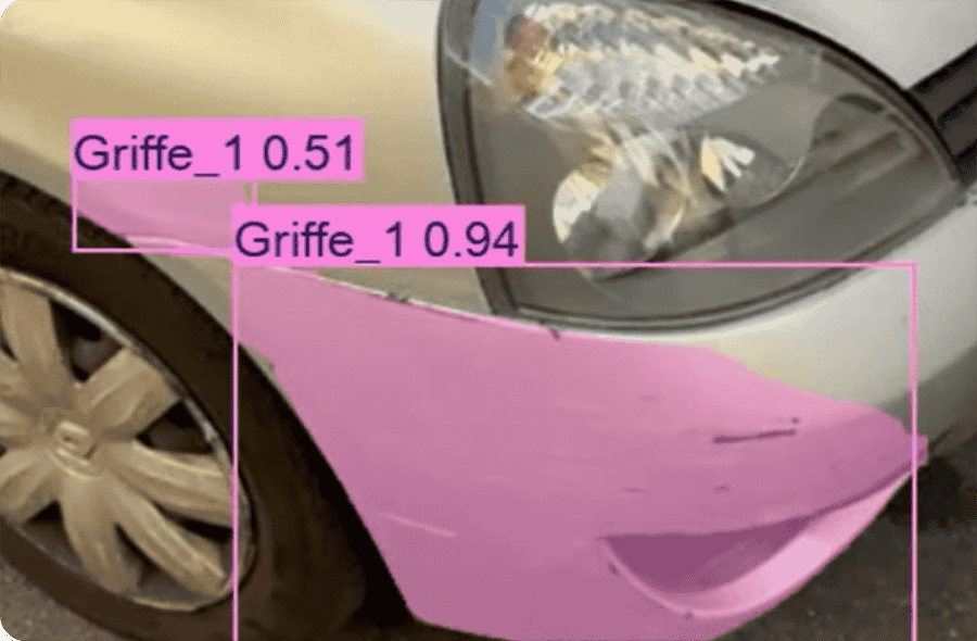 Notre système implémente un modèle de segmentation instance-based capable d’identifier et de délimiter avec précision les zones endommagées sur les véhicules.